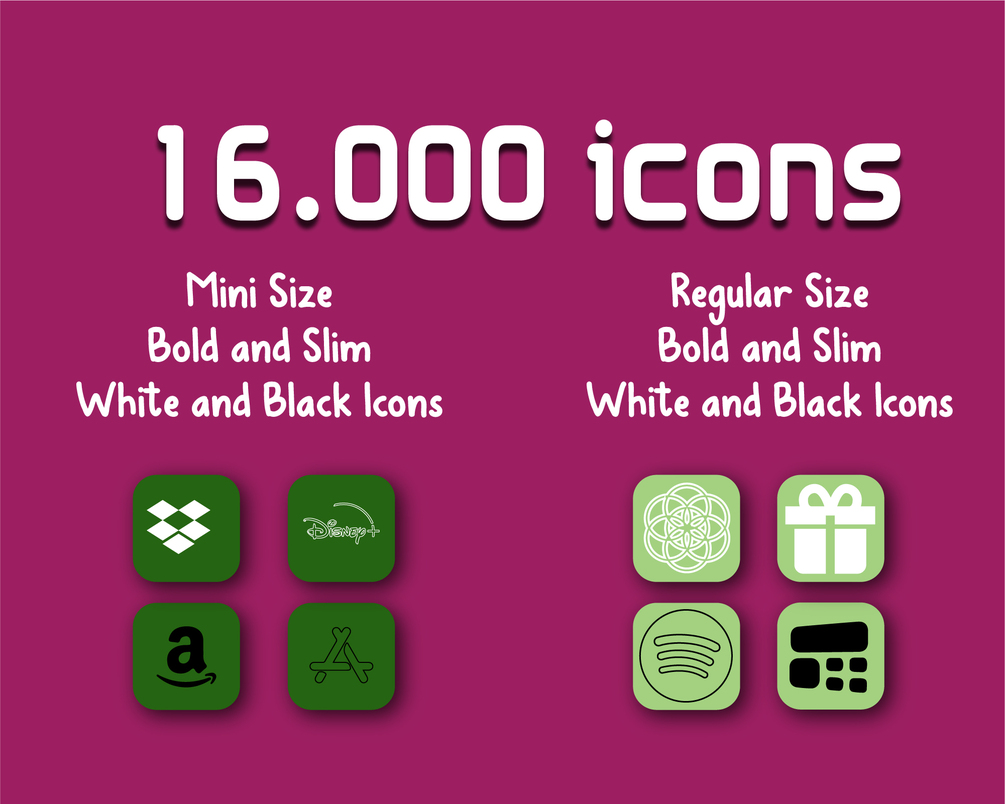 1) 16k app icons, black background color, 8 Neon Color for Icons, Mini Sizes and Slim icons