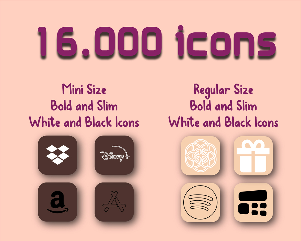1) 16k app icons, black background color, 8 Neon Color for Icons, Mini Sizes and Slim icons